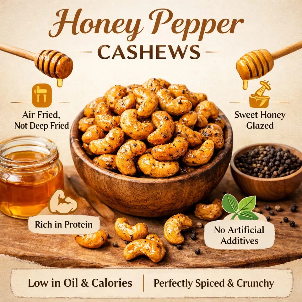 Enjoy the perfect balance of natural sweetness and gentle heat with our Honey Pepper Cashews. Made using premium cashews and lightly coated with real honey and black pepper, these cashews are air-fried to perfection for a crisp, satisfying crunch without excess oil.
